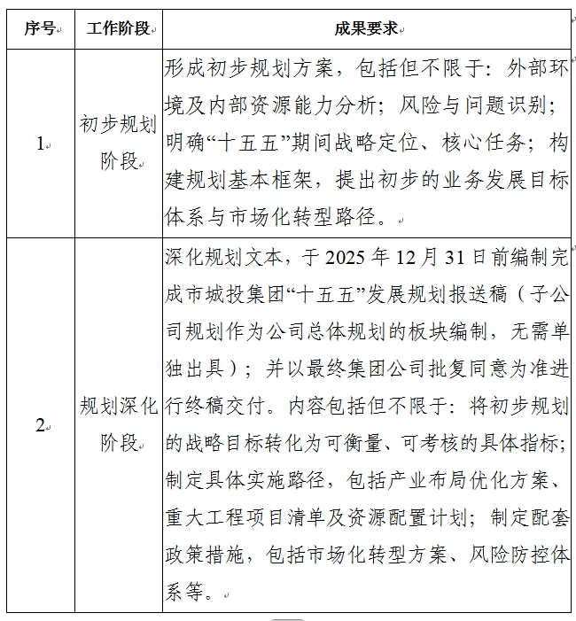 1.服務(wù)內(nèi)容:本次采購旨在選取專業(yè)規(guī)劃咨詢服務(wù)單位,通過專業(yè)機構(gòu)的深度謀劃,助力集團公司在“十五五”期間明確發(fā)展方向,優(yōu)化資源配置,提升核心競爭力,為實現(xiàn)遠期戰(zhàn)略目標奠定堅實基礎(chǔ)。服務(wù)內(nèi)容包括但不限于:外部環(huán)境及內(nèi)部資源能力分析、企業(yè)發(fā)展規(guī)劃目標及業(yè)務(wù)布局、國企轉(zhuǎn)型措施、重大任務(wù)及保障措施、實施計劃、具體實施細則以及在“十五五”推進中進行中期和末期評估等方面。方案需在2025年9月20日前完成初稿,2025年12月31前完成報送稿,根據(jù)反饋意見在采購人要求的時間內(nèi)完成修正稿(終稿)。